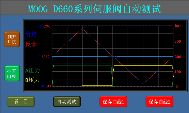 8、選擇滿開口度后點(diǎn)擊“自動測試”可使伺服閥從0開口度逐漸增加到+100%開口度,再逐漸減少到-100%,然后逐漸增加到0開口度;選擇小開口度后點(diǎn)擊“自動測試”可使伺服閥從0開口度逐漸增加到+20%開口度,再逐漸減少到-20%,然后逐漸增加到0開口度;