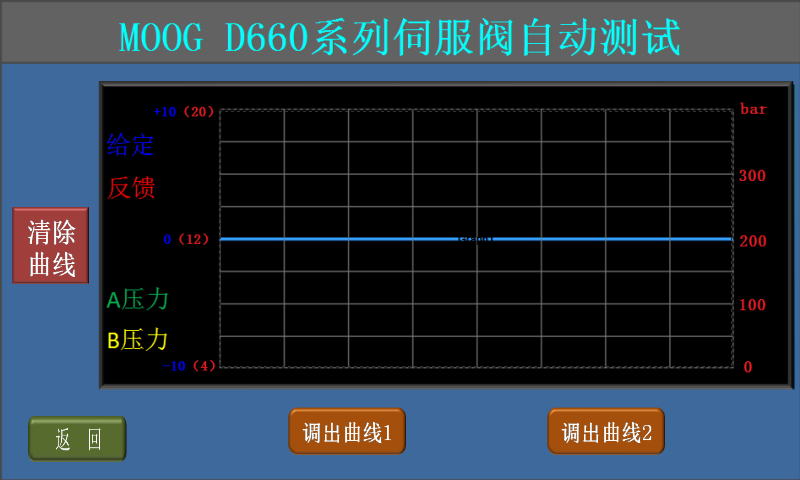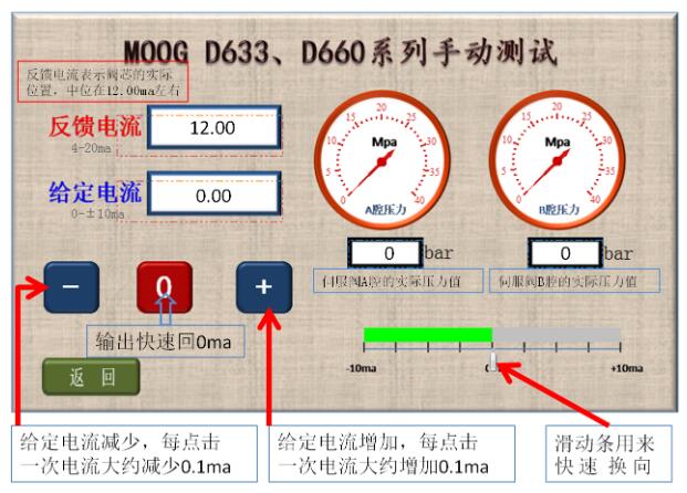 6、伺服閥正常時(shí)的表現(xiàn)為:a、給定電流0ma時(shí),反饋電流在12.00ma,伺服閥輸出的A、B腔壓力相同;b、用滑動條可迅速換向,反饋電流改變且A、B腔壓力差較大;c、點(diǎn)擊增加按鈕,反饋電流逐漸增加且A、B腔壓力差逐漸增大;d、點(diǎn)擊減少按鈕,反饋電流逐漸減少且A、B腔壓力差逐漸減少,過0ma后伺服閥會換向;